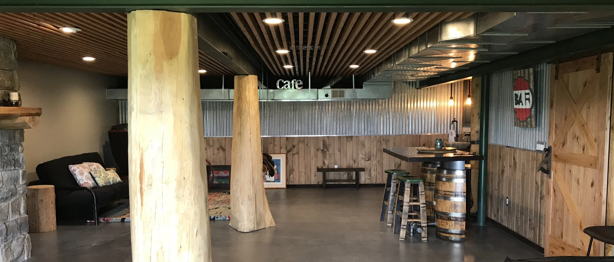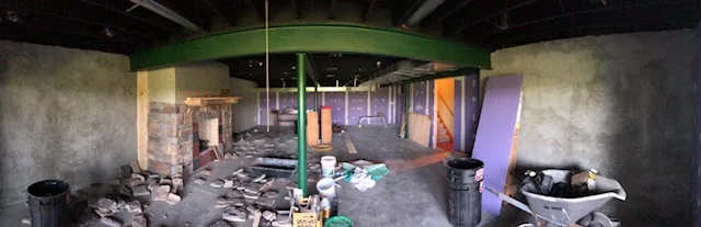 This project began as an unused game room which the Panther team converted to an office, conference room, and gathering area for entertaining, with a full bath & bar with sink.